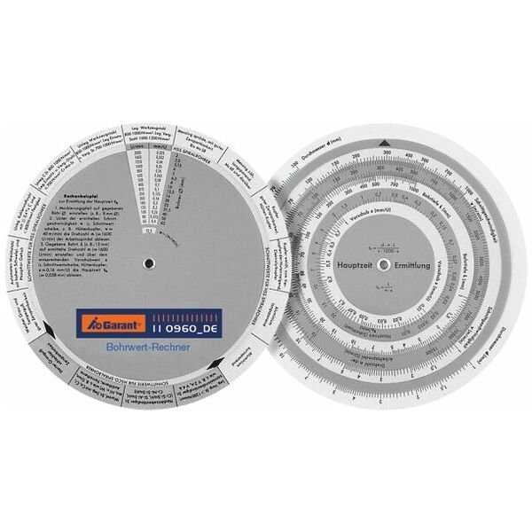Phiên bản: Máy tính dữ liệu khoan (tiếng Đức) dạng đĩa tính hai mặt ⌀ 130 mm bằng nhựa chất lượng cao để xác định tốc độ và bước tiến trong các vật liệu khác nhau. Cung cấp tất cả các giá trị riêng lẻ (tốc độ cắt, tốc độ trục chính, tốc độ tiến dao) cùng với thời gian chu kỳ.
