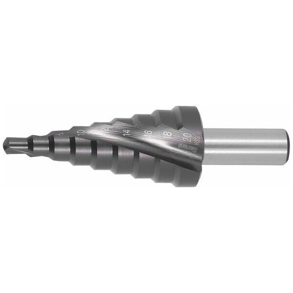 Với mũi khoan định tâm trụ, đường kính ⌀ được hiển thị trong rãnh thoát phoi. Ba mặt phẳng dẫn động trên chuôi. Mũi khoan bậc với rãnh xoắn ốc để thoát phoi tối ưu và lớp phủ hiệu suất cao để chống mài mòn cao.